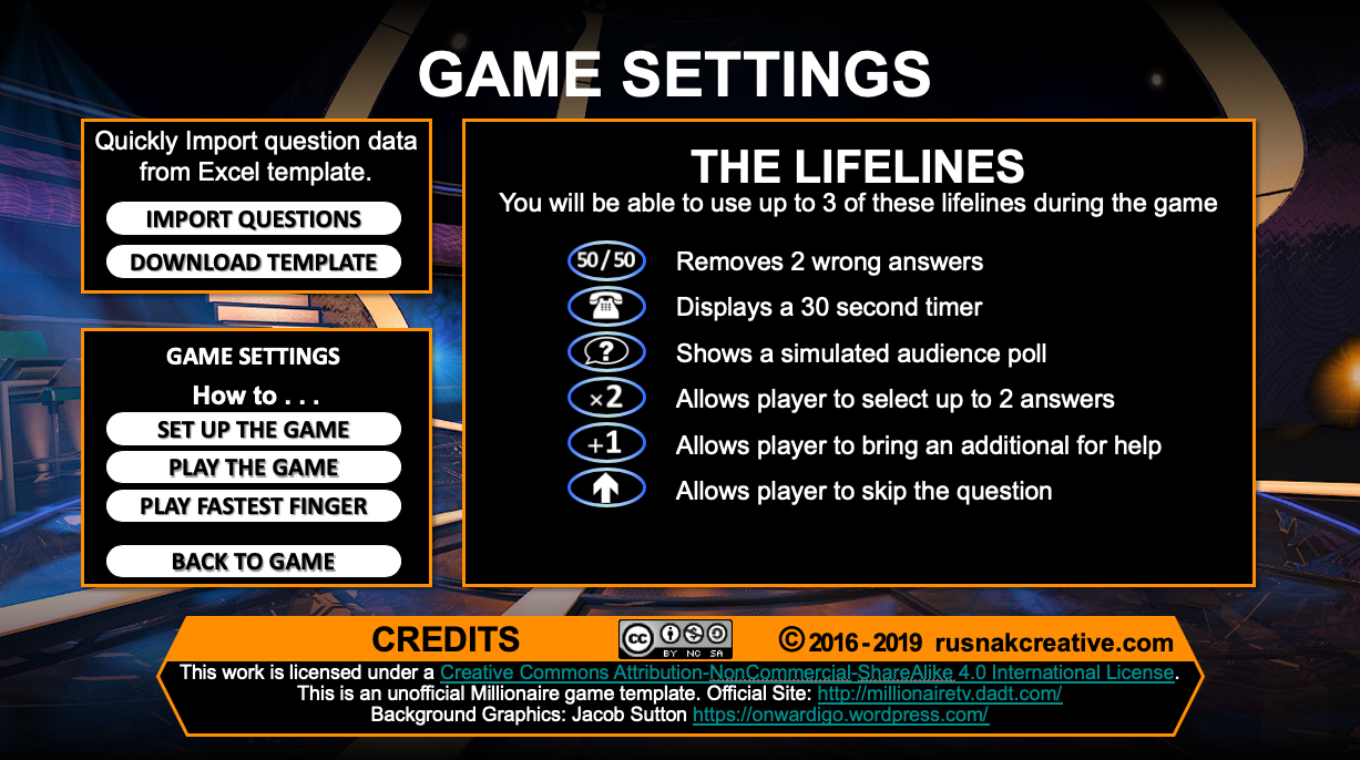 All good examples, and you can find some excellent templates here which include animations + embedded sound. NB: They claim to be Mac-friendly, but don't appear to be (maybe require the latest Mac version of Ppt?). A key part of games like WWTBA Millionaire is thinking about the WRONG answers, and what points they enable you to make. Your contestants could be celebrities (band member/film director/cast, record label or film company owner/boss, marketing/design agency, manager etc. Its VERY easy to find clips on YT to show you the style of the presenter/banter etc (+visuals/sounds)